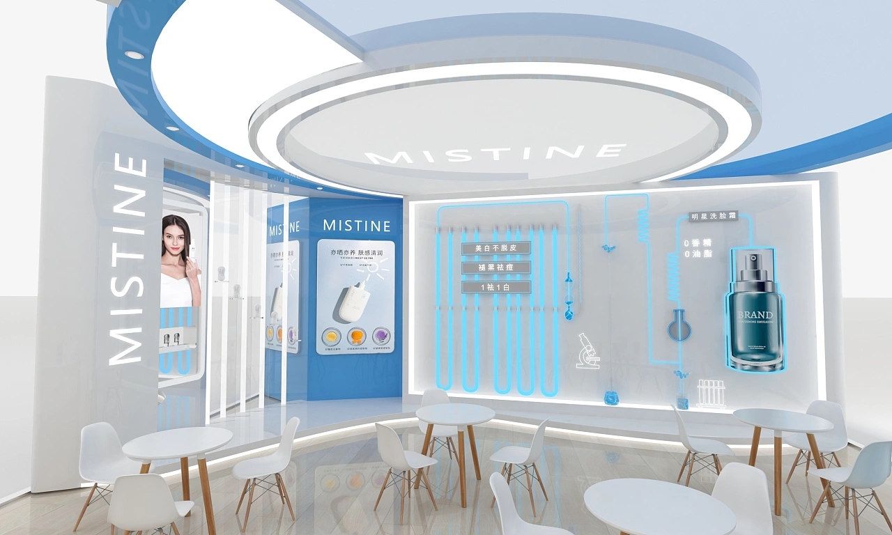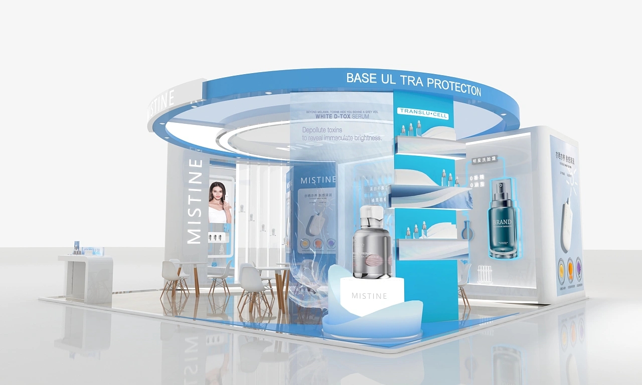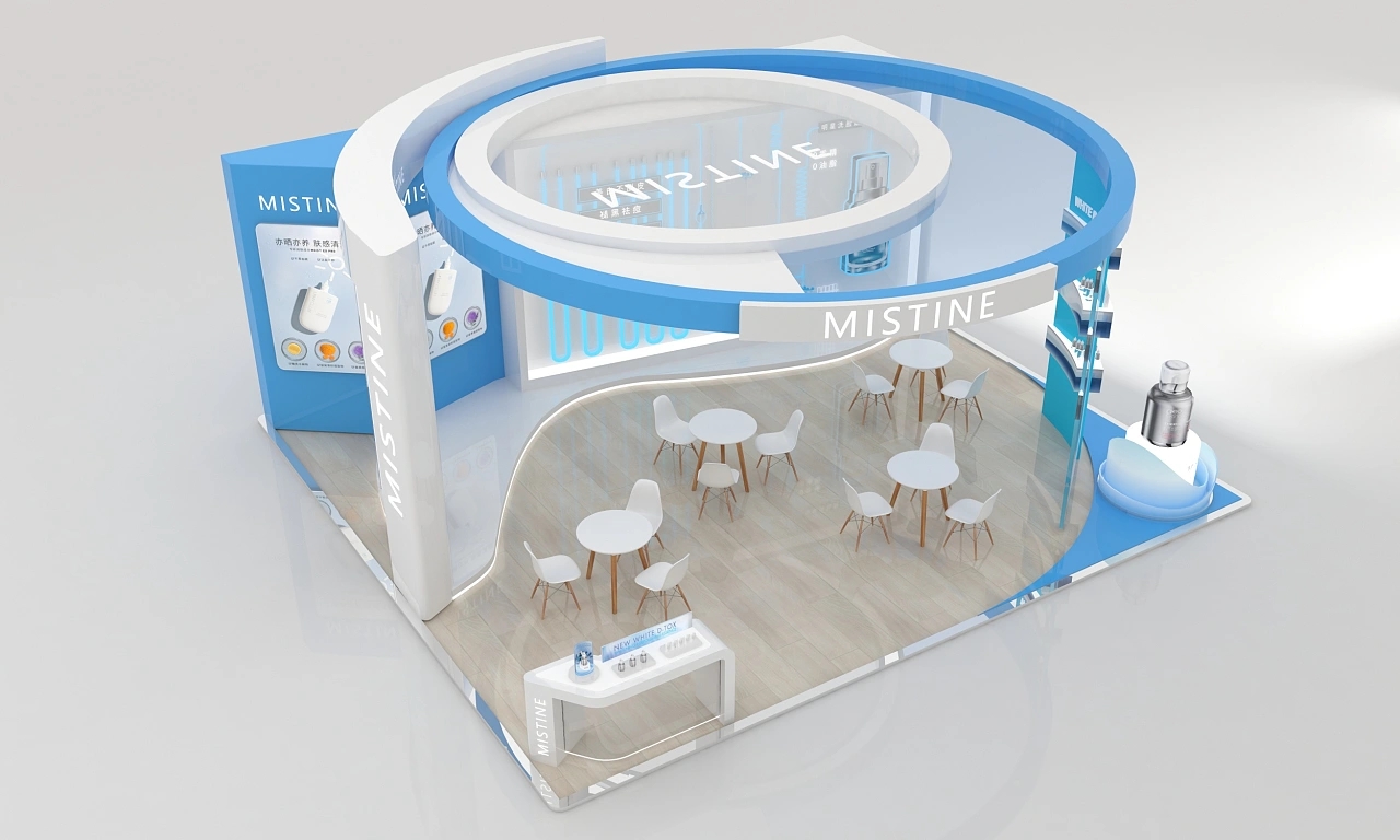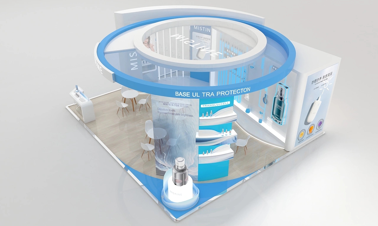 mistine該展臺設計面積為56平,顏色為藍白為主,整體造型是一個圓形的展臺。整個展臺搭建裝修上比較注重質感,地面鋪設了光滑的木地板,展臺氛圍十分清新自然、干凈明亮。展臺右側搭建了該企業中的重點產品的模型,能將參展觀眾的目光聚焦到該產品上。